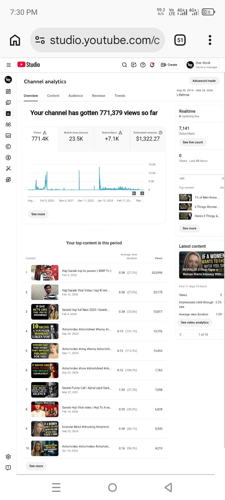 Established youtube account for sale with 7140 subscribers