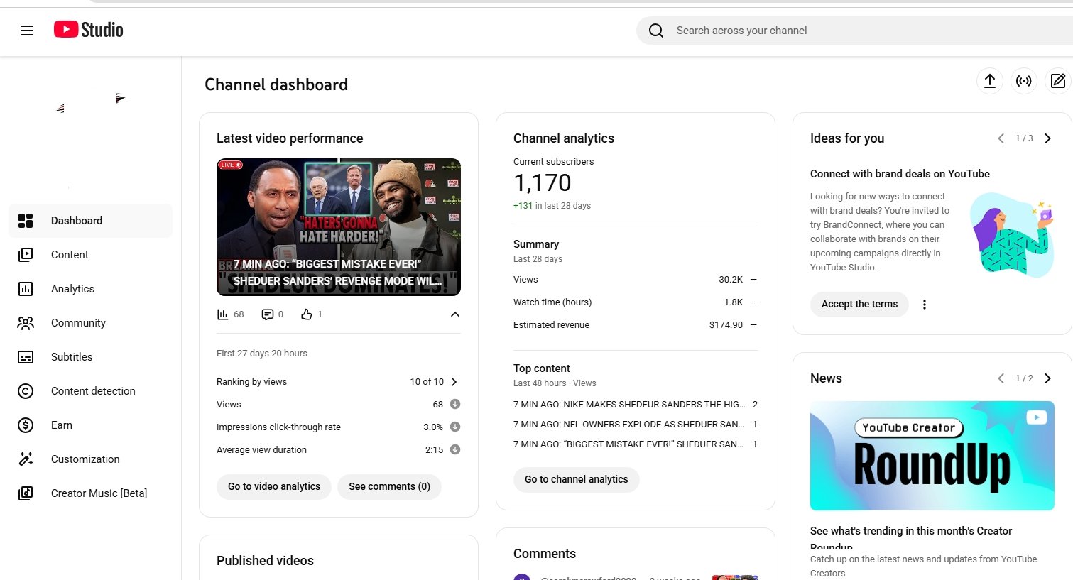 Established youtube account for sale with 1170 subscribers